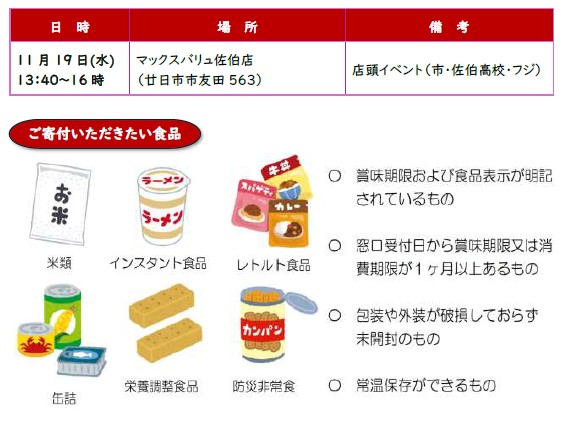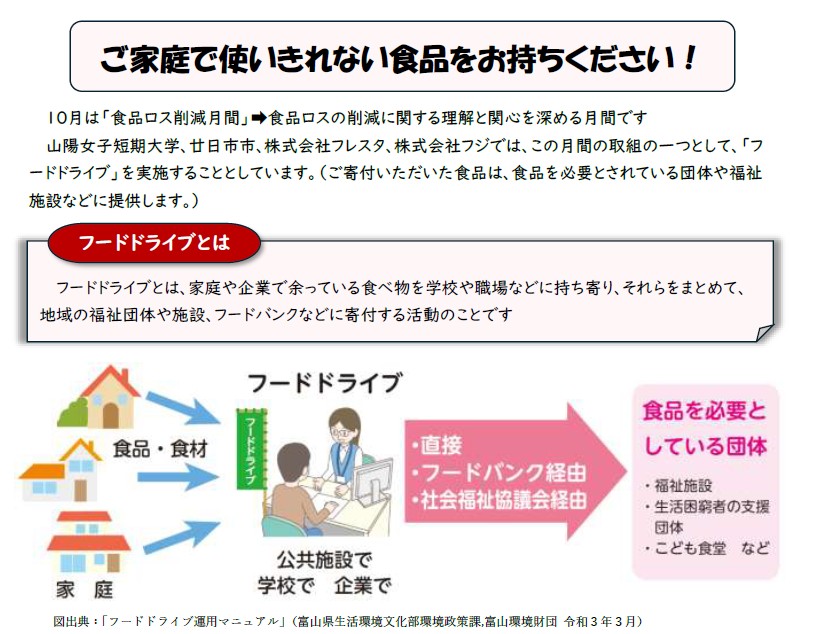 ホーム食ロス<10月開催>イベントでフードドライブに参加しませんか? 検索 お知らせ内容で探すすべて食べきりレシピNEWイベント情報お知らせピックアップフードドライブ食品ロス削減協力店 <10月開催>イベントでフードドライブに参加しませんか? 2025.09.24 山陽女子短期大学・廿日市市・株式会社フレスタ・株式会社フジでは、食品ロスを減らすためにみんなで考え、一人ひとりが行動を起こしていただくため、10月食品ロス削減月間を中心に「フードドライブ」を実施します。イベントを楽しみながら、食べ物をむだにしないアクションにもトライしましょう! チラシPDF 前の記事へ 次の記事へ 一覧に戻る Pick UP!! ピックアップ記事一覧 食ロス 2025.09.24 食べきりレシピ 記事をみる 食ロス 2025.10.20 フードドライブイベントを実施しました!~廿日市市×山陽女子短期大学×フレスタ~ 記事をみる 食ロス 2025.09.24 冷蔵庫レスキュー20・1 記事をみる 食ロス 2025.05.09 (株)フジ×廿日市市社会福祉協議会×廿日市市 フードバンクに関する三者連携協定を締結 記事をみる 食ロス 2025.03.05 【田舎茶屋わたや大野店】食品ロス削減で、みんなが楽しめる食の場へ 記事をみる 食ロス 2025.02.04 【地元のごちそう 自然のめぐみキッチン】「廿日市市ならではの食卓」が描く未来 記事をみる ピックアップ記事一覧