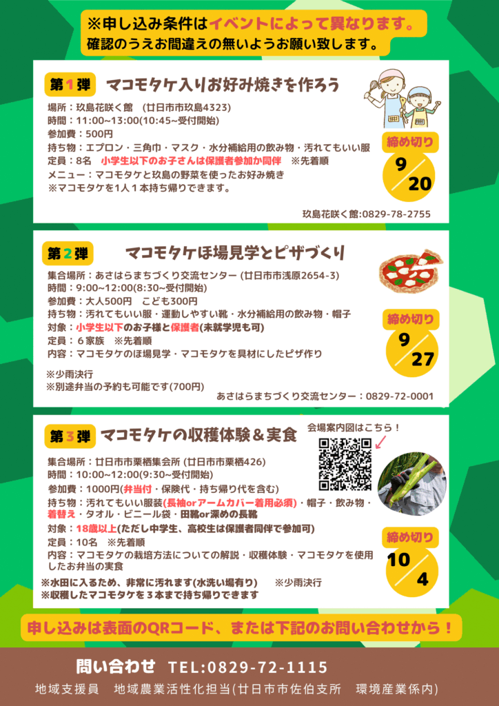| 主催・問合せ | 主催:廿日市市産業まちづくり委員会 問合せ:廿日市市農林水産課 TEL : 0829-30-3143 |