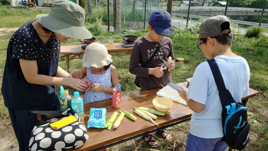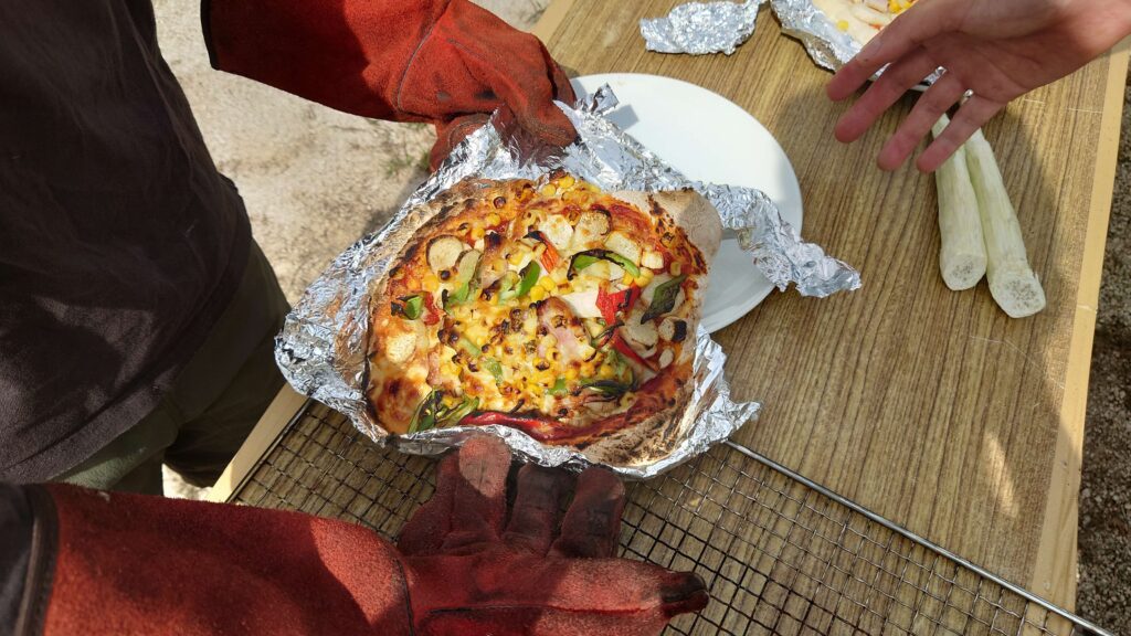 マコモタケの田んぼを見学した後、収穫したマコモタケを使ったピザ作りが体験できます。