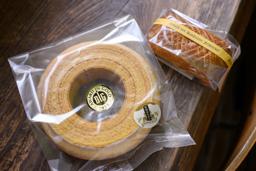 バウムクーヘンは、DLG(ドイツ農業協会)主催の国際食品品質競技会で金賞を受賞。もちろんこちらもベーキングパウダーは使わず、約3時間かけて焼き上げる。〈宮島はちみつ〉を使用しており、口に運ぶとやさしい甘さとともに、ふわりと香りが鼻に抜けていく。