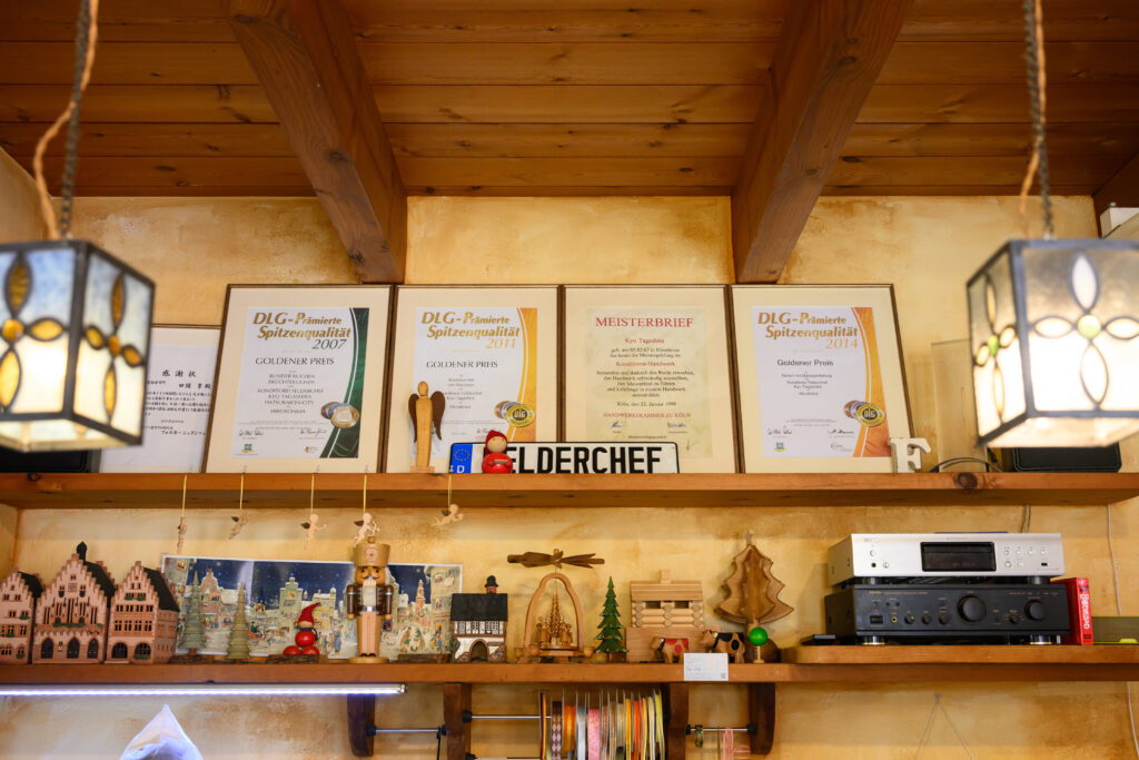 海外では想像もつかないほどの厳しい修行を重ね、ドイツ菓子マイスターの資格を取得した田頭さん。本場で培った技術に加え、レシピやアイデアをこの店で存分に披露している。毎年10月から予約が始まるシュトーレンも金賞を受賞し、店内には賞状がズラリ。