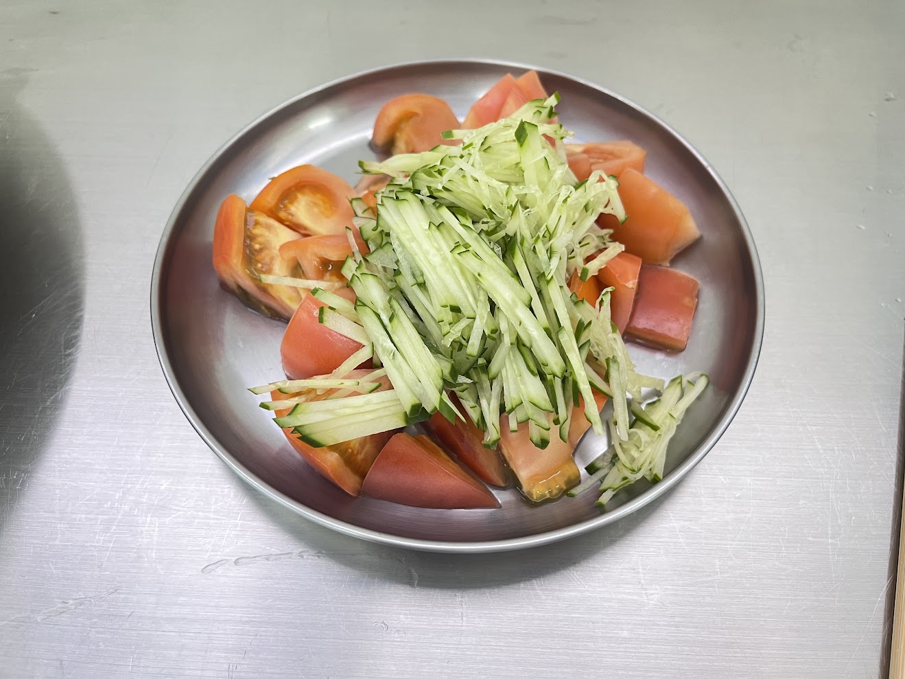 ①きゅうりは千切りにする。トマトはざく切りにする。