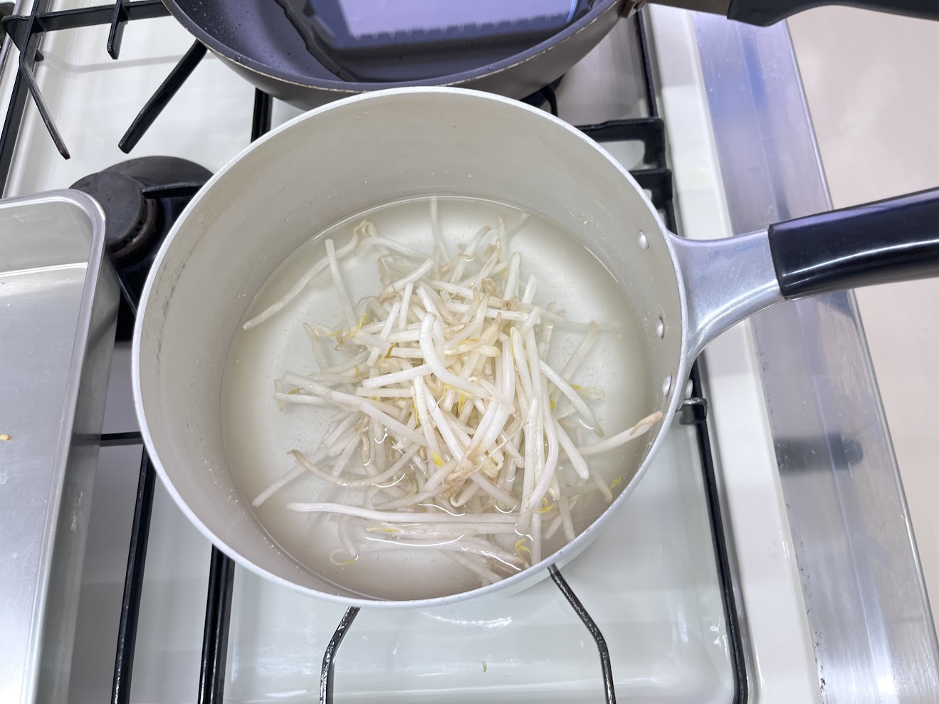 ②鍋に水と中華スープの素を入れ強火で加熱し、煮立ったらもやしを加える。