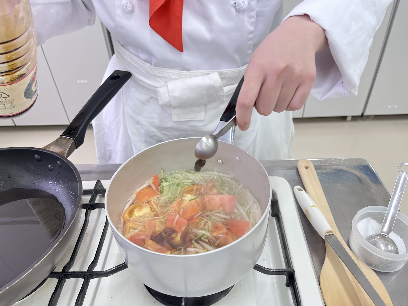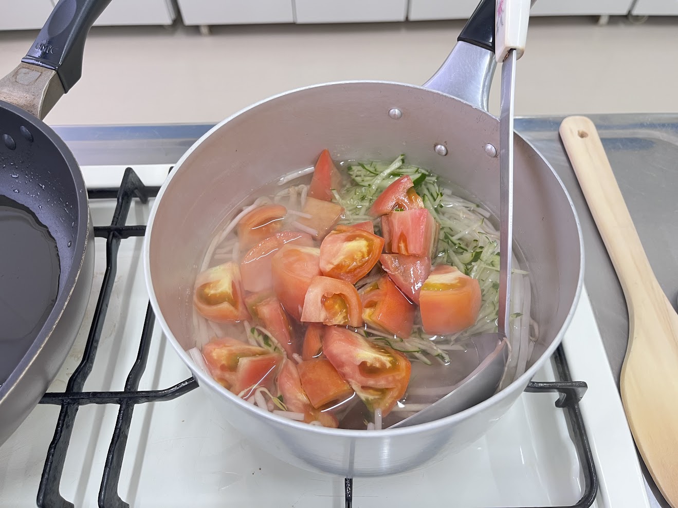 ③もやしに火が入ったら、きゅうりとトマトを加えひと煮立させる。