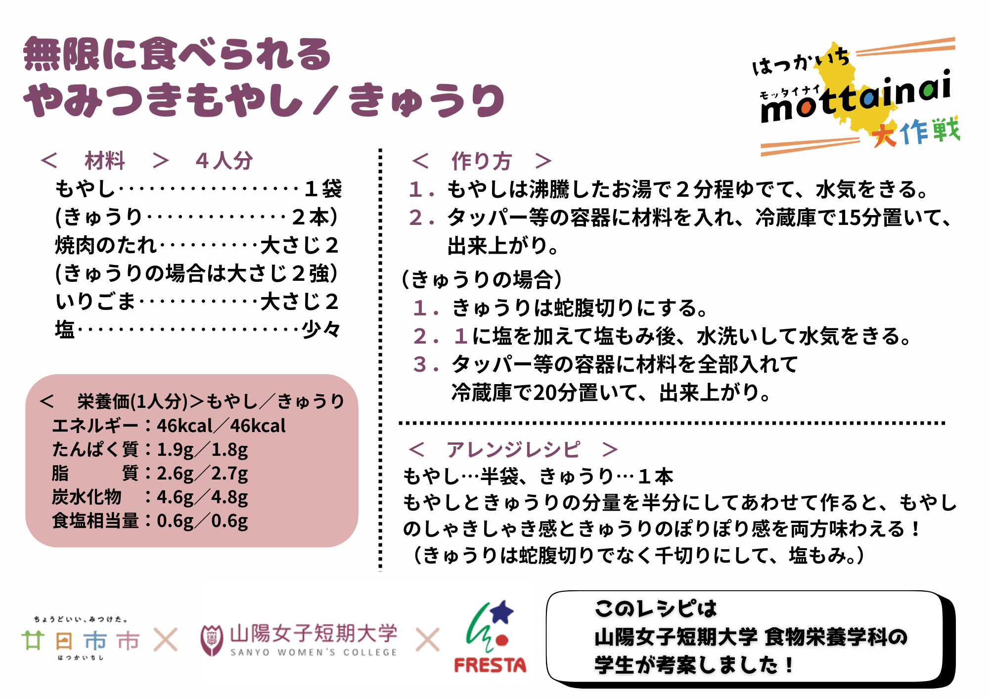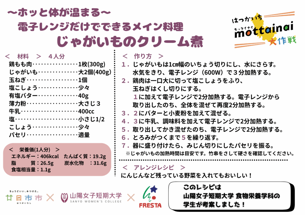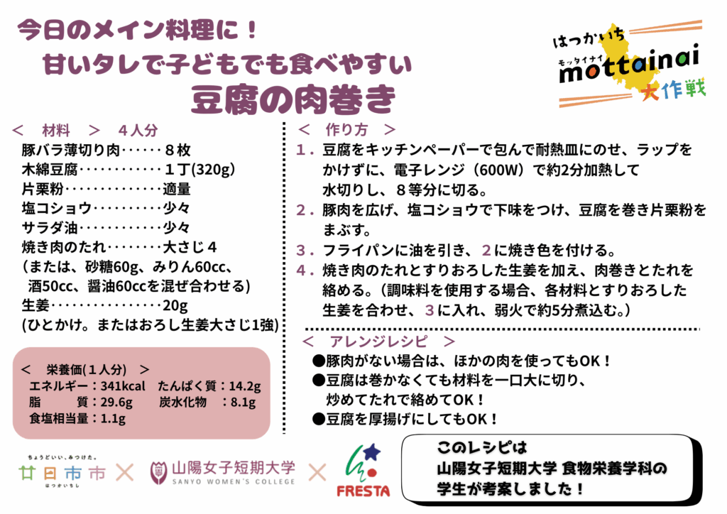食品ロスを少しでも減らしていくため、家庭で余りやすい食材を使ったレシピを開発しようと、廿日市市、山陽女子短期大学食物栄養学科、株式会社フレスタの三者が共同で取り組んだ「食べきりレシピ」プロジェクト。