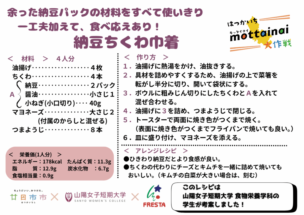 市民アンケートから見えた“意外と使い切れていない食材”を使って、家庭で簡単に作れる「食べきりレシピ」を山陽女子短期大学・食物栄養学科の学生が考案しました。