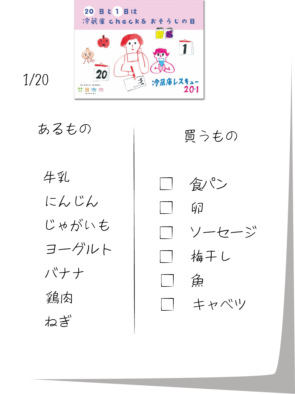 ①マグネットを冷蔵庫に貼って、20日と1日に冷蔵庫の中を確認。余っている食材をレスキューしよう!
