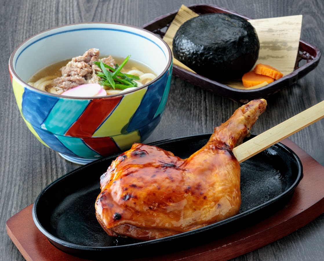 わたやといえば「山賊焼き」と「山賊むすび」。うどん付きのランチなら、名物を一度に味わえる。「もっと熱々で味わってほしい」という店の思いから、山賊焼きは鉄板で提供。味はタレ・塩・旨辛みその3種類から選べる。豪快にかぶりつくのも、添えられたフォークとナイフで切り分けてシェアするのもまた楽しい。