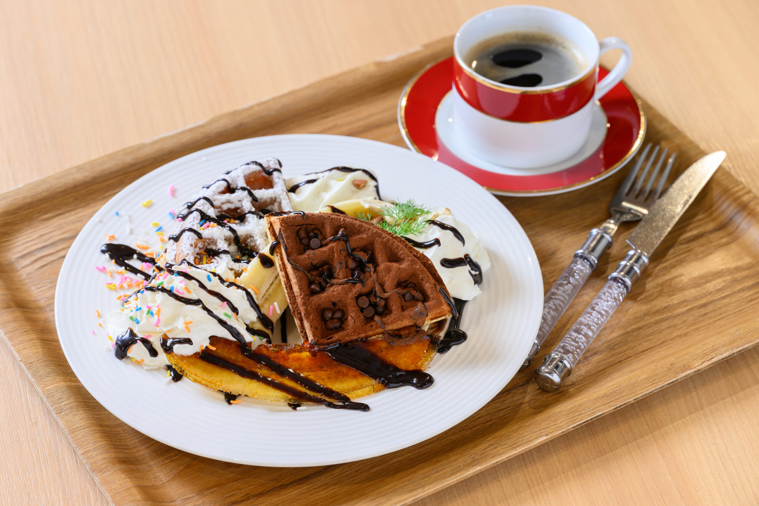デザートセットの中で一番人気のプレート。チョコココアとココナッツのワッフルを重ね、さらに完熟のバナナとキャラメリゼしたバナナのスライスを添える。まるごと2本分を使った贅沢仕立てで、ホイップクリームやナッツ、チョコチップと一緒に頬張れば、満足感たっぷりのひと皿に。コーヒーや、100%りんごジュースなど、選べるドリンク付き。