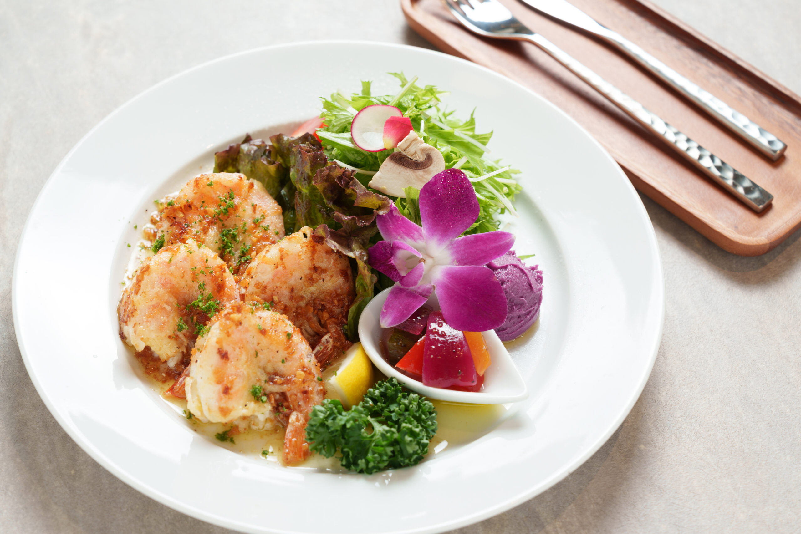 ガーリックがきいた大ぶりのエビは、殻ごと豪快に頬張るのが醍醐味。旨みと香ばしさが口いっぱいに広がっていく。添えられるのはサラダ、カラフル野菜のピクルス、優しい甘さの紫芋のポテトサラダ。ドレッシングから副菜まで手作りにこだわっているのもうれしい。