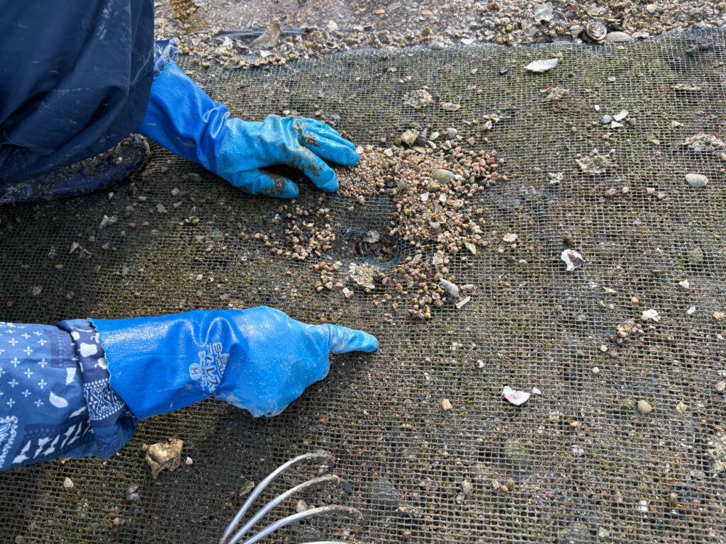 育て方も独自で、8.8haの干潟を450〜500区画に分け、組合員が各自の"庭"として管理する「区割り漁法」は全国的にも珍しい手法です。春には稚貝を各組合員に配布し、1〜5年かけて育成。特に4.5cm超の大粒は4〜5年もので、非常に貴重な一粒です。