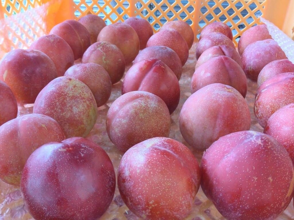 主力は7品種(いくみ、あやか、李王、サンタローザ、サマーピュート、貴陽、サマーエンジェル)。完熟したプラムは、驚くほどジューシーで果肉が甘く、冷やして食べるのがおすすめ。皮ごと食べられ、果糖が引き立つひんやりとした味わいは、ひと口で印象が変わるほど。