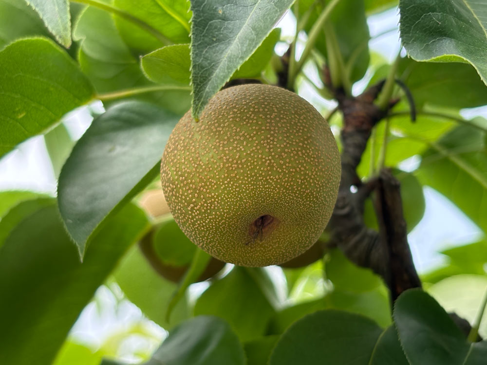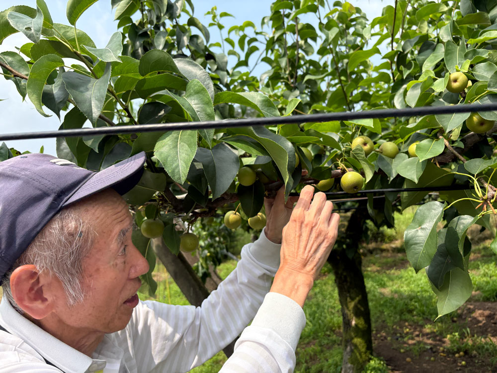 梨が大きくなり始める7月、丁寧に行われる「袋掛け作業」。虫や傷から梨を守るだけでなく、見た目の美しさを引き出すための大切な工程です。袋掛けの前には、変形した実を取り除く「摘果(てきか)」が必要で、これを怠ると袋の中で実が割れてしまいます。丁寧に袋をかけることで、まるで「赤ちゃんがかぶれそうなやわらかい袋」で包まれた、べっぴん梨が出来上がるのです。