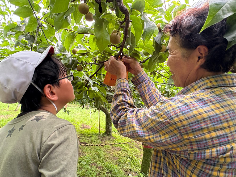 毎年恒例となっている津田小学校3年生の袋がけ野外活動。袋に名前や絵を描き、収穫のときを心待ちにする子どもたちの姿は、安井さん夫婦にとっても励みです。「また一年がんばろう」と思える源になっているといいます。農業の厳しさと楽しさを体感できる場として、長く大切に続けられています。