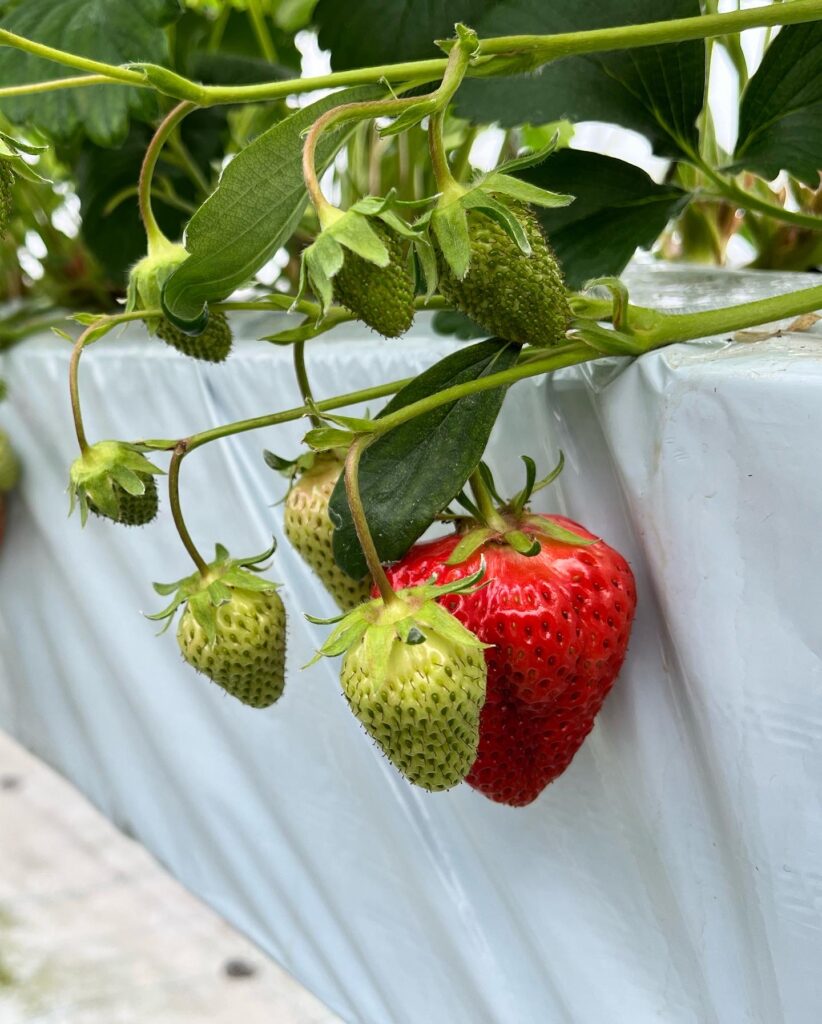 ワイ・ワイファームでは「高設栽培」という方法を採用しており、白いビニールで覆われたプランターの上に、緑の葉と真っ赤なイチゴが美しく並んでいます。