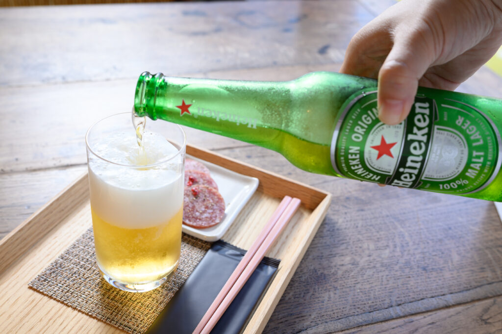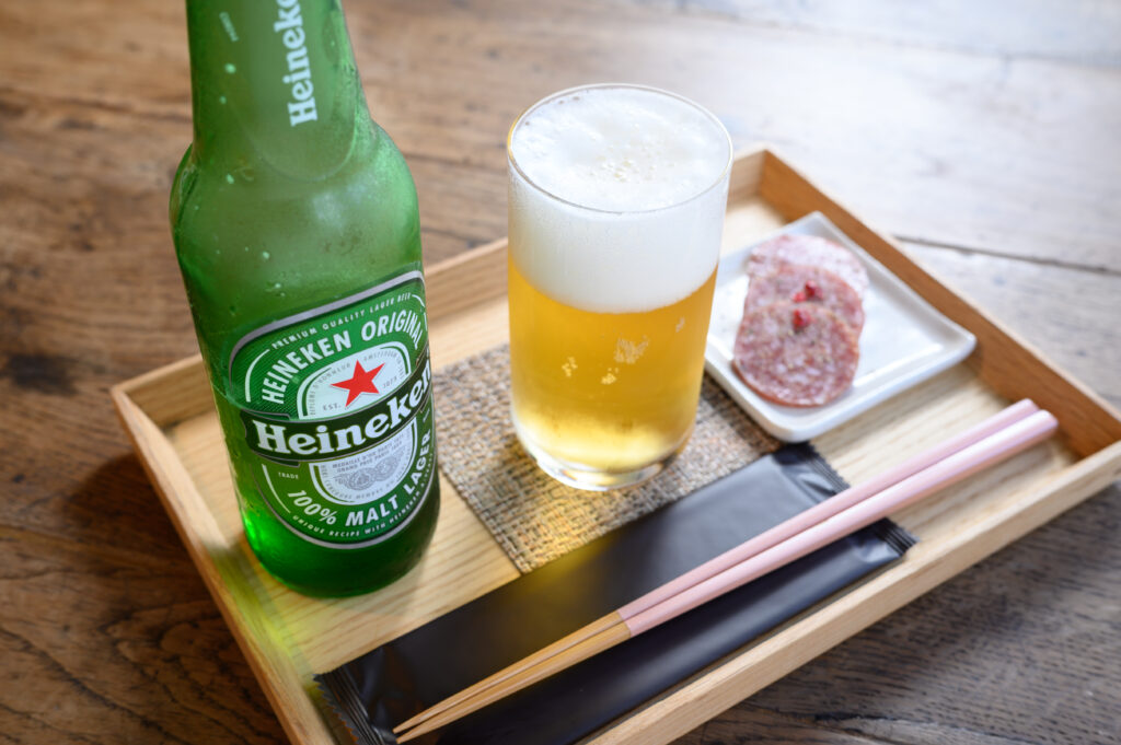 宮島を巡ったあとに、夕暮れの風とともにいただく、軽快で爽やかなラガービール〈ハイネケン〉はいかが? 飲むほどに旅気分がふくらんでいきそうだ。この日の小鉢は、ブラックペッパーとピンクペッパーをきかせたサラミ。軽く一杯楽しみたい人にオススメのセットだ。ほかにも、広島・山口生まれの日本酒などアルコールメニューもスタンバイする。