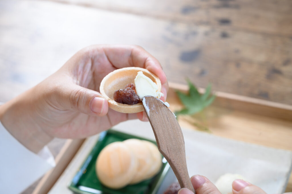 『三谷製菓』に特注したもなかは、朝挽きの米粉で香ばしく焼き上げたサクサクの食感。そこに、水分を多めに炊き上げたあんことクリームチーズを乗せていただく。あんこの優しい甘みと、クリームチーズのまろやかな酸味のハーモニーが心地よい。