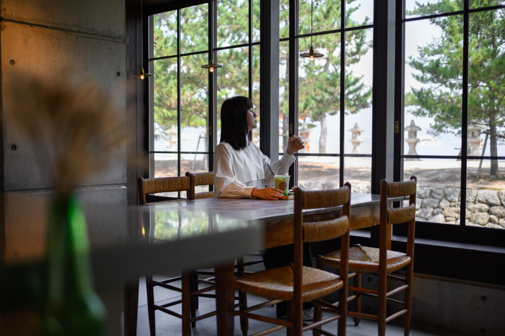 『嚴島神社』を参拝したあとや『宮島水族館』を訪れる前にも立ち寄りたい、カフェ&ギャラリー。風が心地よい季節には、1階の窓を大きく開け放ってくれる。広々とした空間で、ゆったりひと休みを。