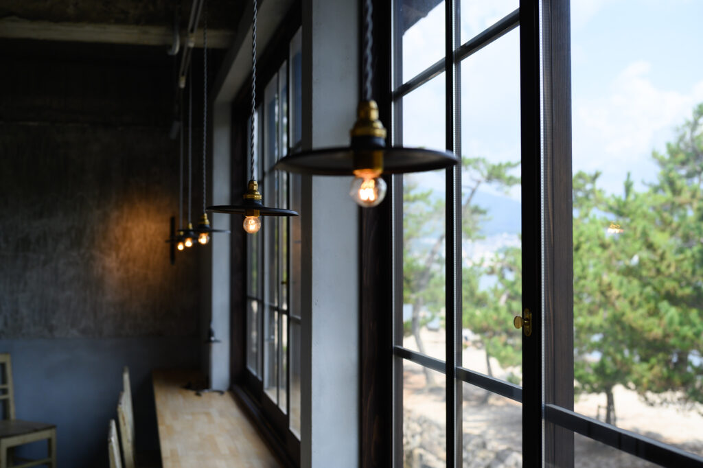 2階はギャラリーやテーブル席がある空間。ギャラリーでは展示販売も行われており、気に入った作品は購入できる。また、広島でアイアン家具や看板、個性豊かな表札などを製作する金属造形作家・辻陽水さんのランプシェードが、店内のあちこちに吊り下げられ、やわらかな光を放っている。