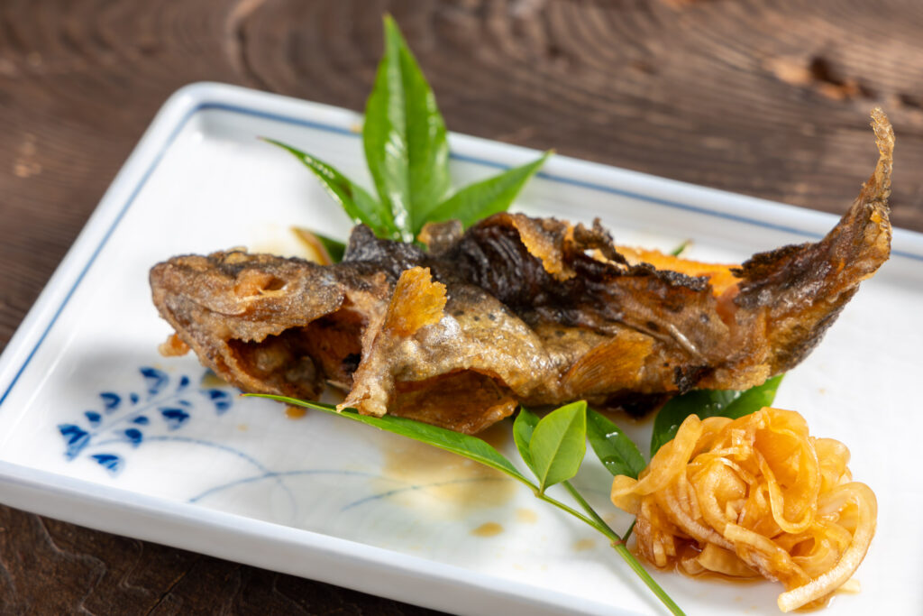 太田川最上流の清らかな水で育った魚を釣ってすぐに調理するため、その鮮度は抜群。定番の塩焼きや唐揚げはもちろん、天ぷらや刺身、南蛮漬けといった珍しい料理も味わえる。「渓流魚の王者・イワナ」と「渓流魚の女王・アマゴ」、その味や食感の違いを食べ比べるのも楽しみのひとつ。
