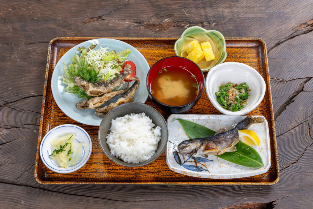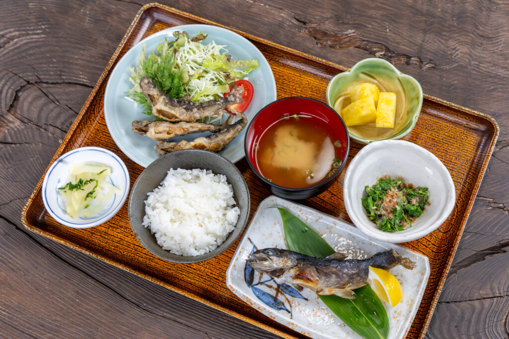 釣りをしなくても、食堂として気軽に利用できるのも「つり堀亭にしむら」の特徴。人気の定食には、吉和産の「ひとめぼれ」や「コシヒカリ」など、農事組合法人よしわや地元農家から仕入れた米を中心に使用。調味料には佐伯醤油を取り入れるなど、地域の味わいを大切にしている。シンプルながらも川魚の美味しさを存分に堪能できる。