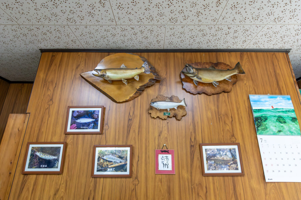 過去に釣れた40~60cm級の大イワナが店内に飾られている。