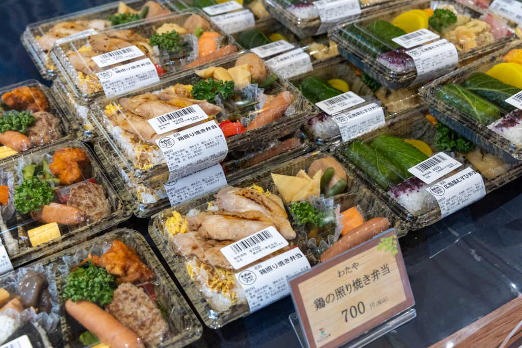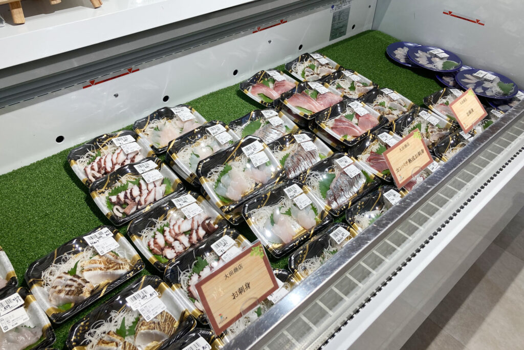 地元店から仕入れるパンや弁当は、お昼には完売するほどの人気ぶり。鮮魚コーナーには広島中央魚市場や地元の漁師さんからその日仕入れた活きの良い魚が並び、週末には熟成魚も楽しめます。