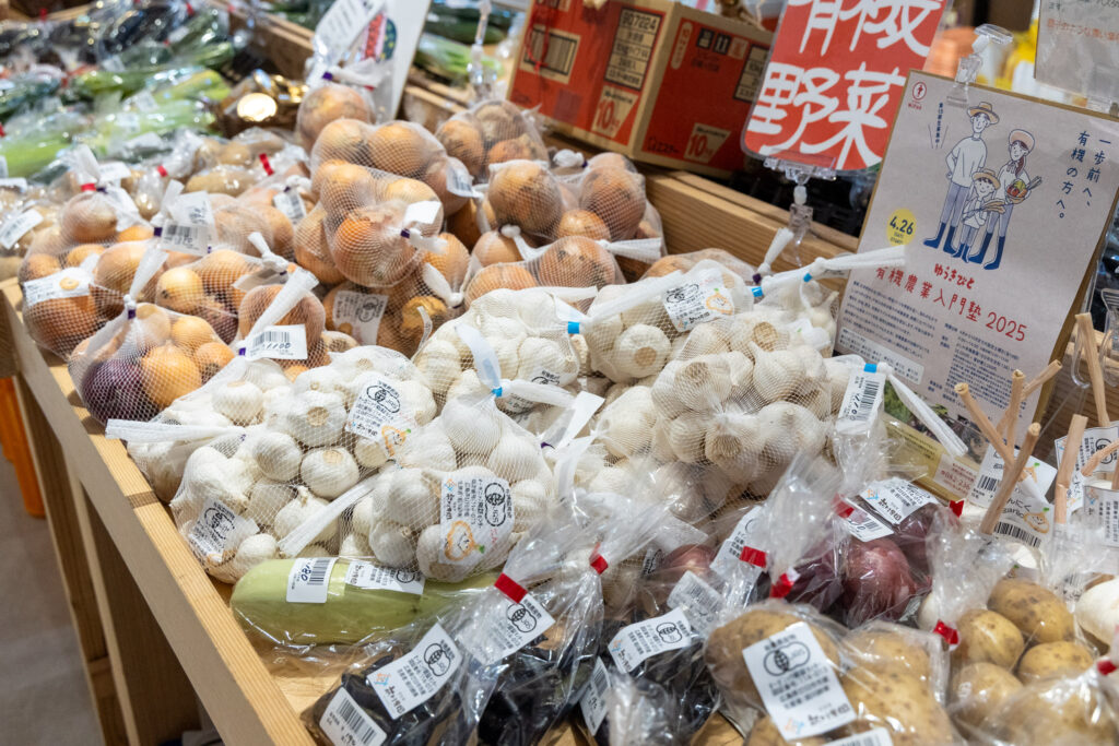 有機認証を持つ農園の出荷や、地元ならではの人気商品が並び、地域住民の毎日の買い物に親しまれています。