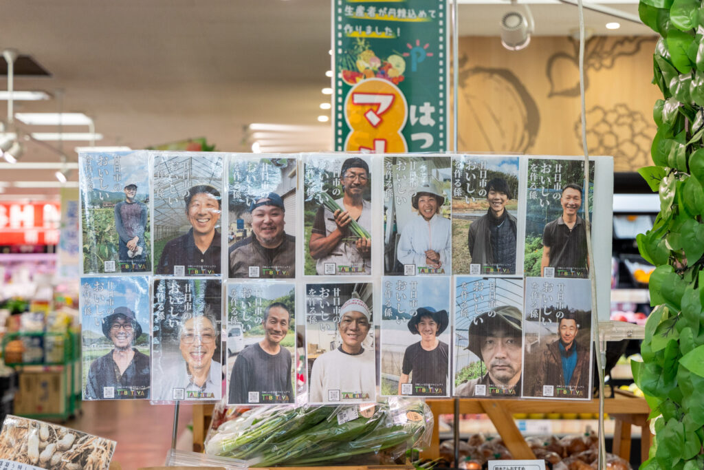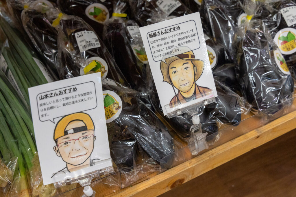 地産地消の取り組みを始めた当初6名だった取扱生産者は、現在15名にまで増加。似顔絵やコメントを添えた紹介も行い、顔の見える関係づくりを大切にしています。