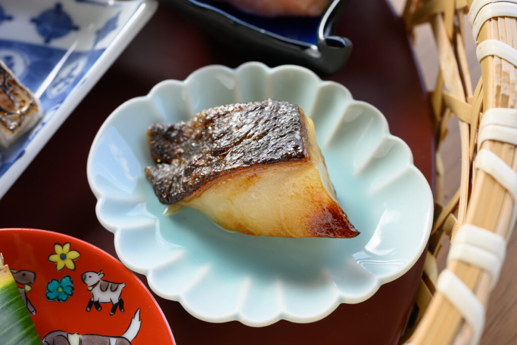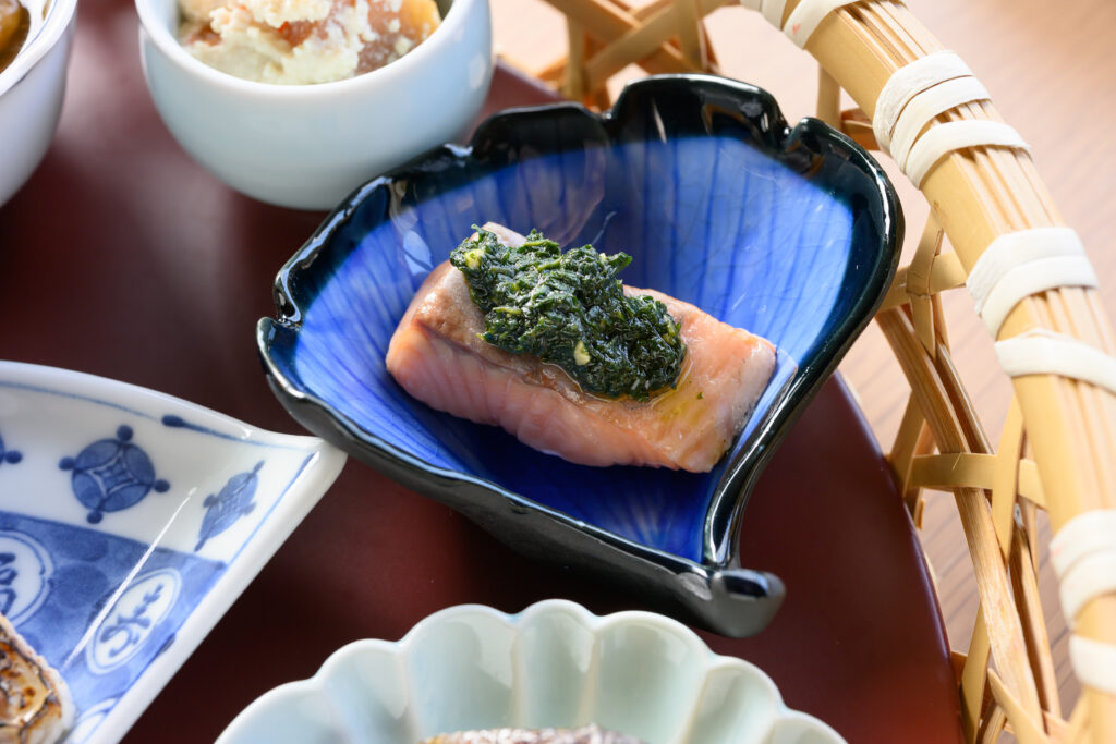 ほかにも、58℃で45分間じっくり火を通したサーモンに、大葉のソースを添えた小鉢を用意。銀だらの味噌漬けなども登場し、どれも技の確かさが伝わる。
