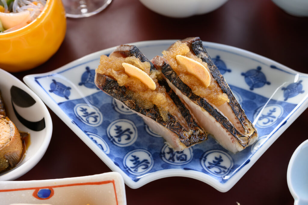 この日に提供されたサワラの炙りは、5日間熟成させたもの。血合いを取り除き、真空状態で氷水に寝かせて旨みをぐっと押し上げる。皮目を香ばしく炙り、ニンニクチップを挟んだひと切れは、噛むほどに豊かな余韻が広がる。