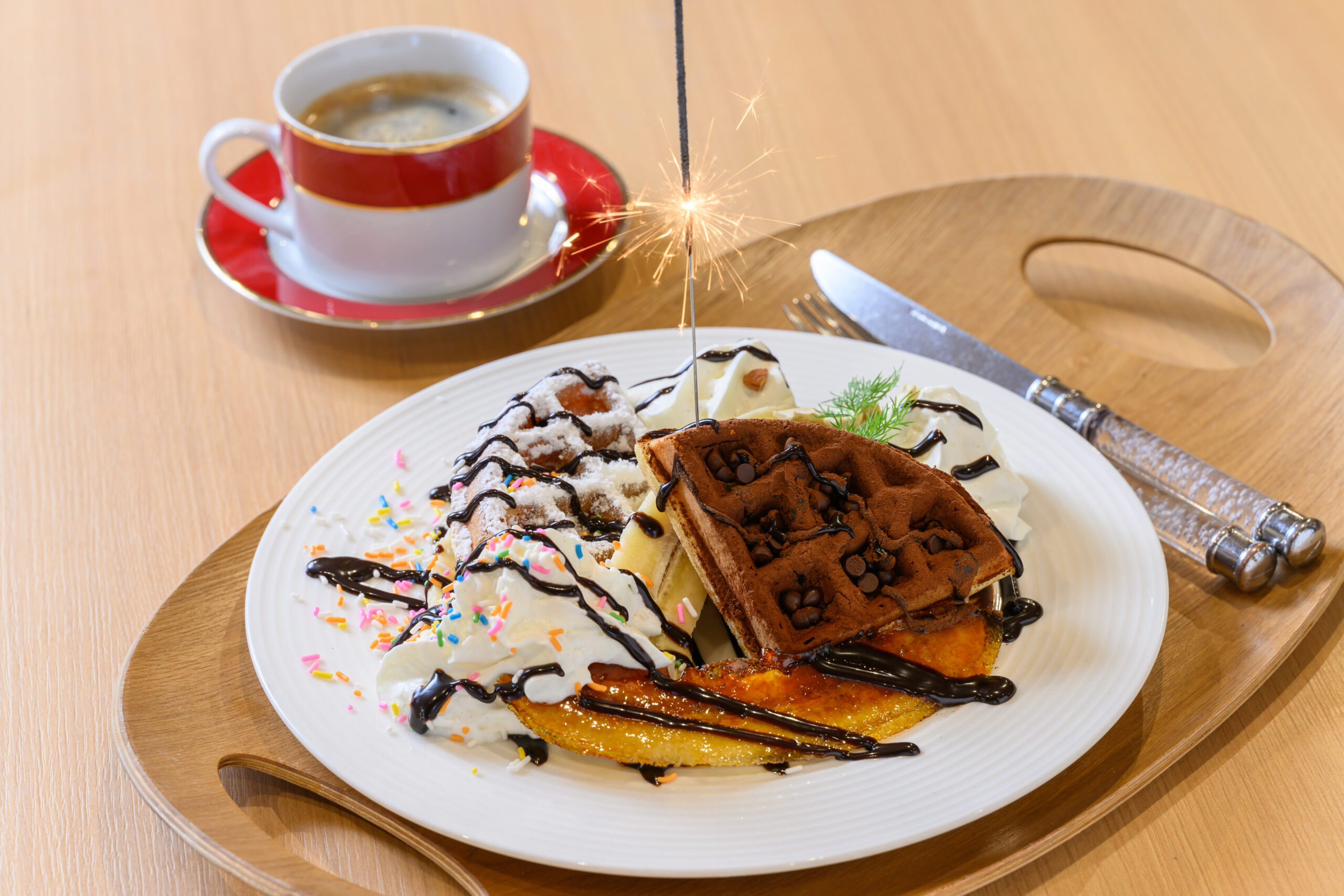 デザートセットの中で一番人気のプレート。チョコココアとココナッツのワッフルを重ね、さらに完熟のバナナとキャラメリゼしたバナナのスライスを添える。まるごと2本分を使った贅沢仕立てで、ホイップクリームやナッツ、チョコチップと一緒に頬張れば、満足感たっぷりのひと皿に。選べるドリンク付き。