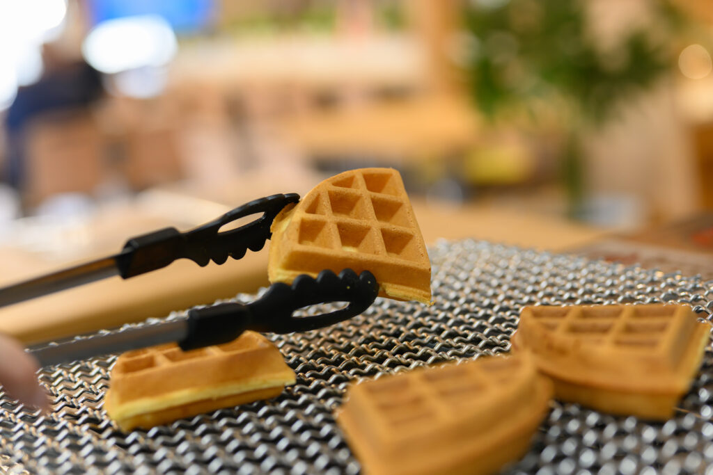 たまごサラダやベーコンと合わせる食事系ワッフルの生地には、ほんのりスパイス感を添えるナツメグを混ぜ込み、トッピングの味わいが引き立つよう工夫されている。一方、デザートワッフルの生地にはマカダミアナッツのシロップを加え、フルーツやクリームとも絶妙に調和するように、甘さ控えめに仕上げている。どちらのアメリカンワッフル生地も、外はカリッと、中はふんわりしているのが特長だ。