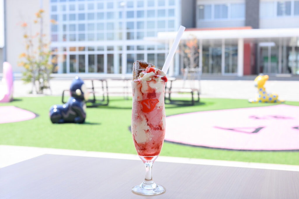 オーダーごとにミックスしてくれるフラッペ。濃厚ないちごの甘酸っぱさとミルクのコクが重なり、飲み応え十分。こちらはミニワッフルが乗っているので、小腹も満たしてくれそうだ。午後のひと休みにうれしい一杯は、イートインでもテイクアウトでも楽しめる。抹茶やマンゴー、ブルーベリーなど全8種類がラインアップ。